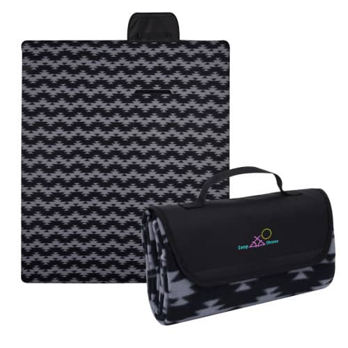 Large blanket made of 100% polyester fleece that rolls up, measures 48" x 53" and has an attached handle for easy carrying