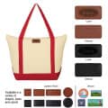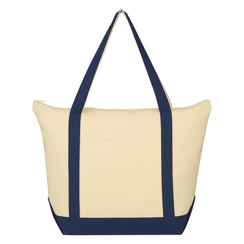 Made Of 12 Oz. Cotton Canvas. Top Zippered Closure. Front Pocket. 7" Bottom Gusset. 23 2/5" Handles. Spot Clean/Air Dry.