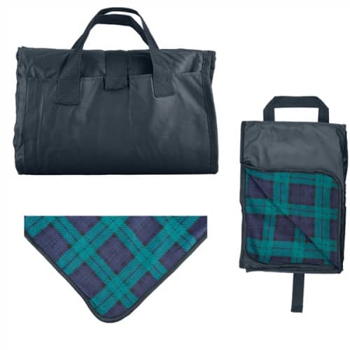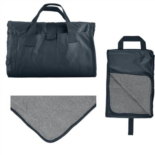 50" x 60" foldable picnic blanket made of double-sided polyester/fleece; folds into carry size with two nylon web handles.